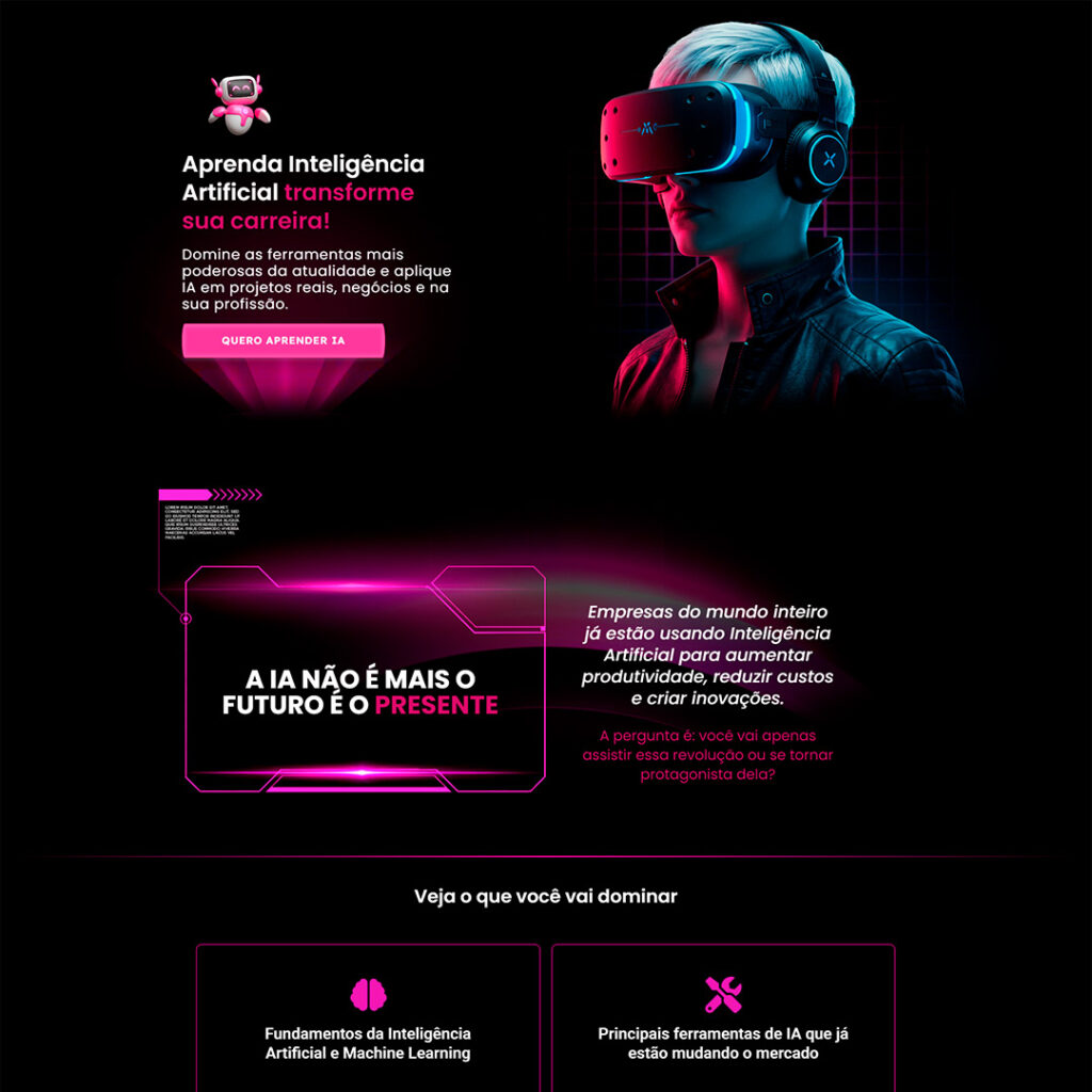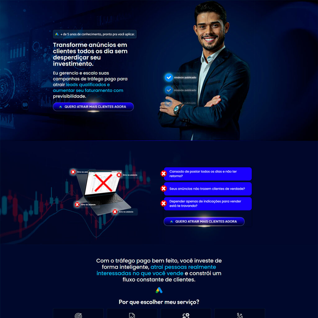 Sou criador de landing pages únicas, estratégicas e personalizadas, desenvolvidas para refletir a essência da sua marca, gerar autoridade e impulsionar resultados. Cada detalhe é planejado com foco na experiência do usuário e alta conversão — unindo design, copywriting e estrutura otimizada em um só projeto.